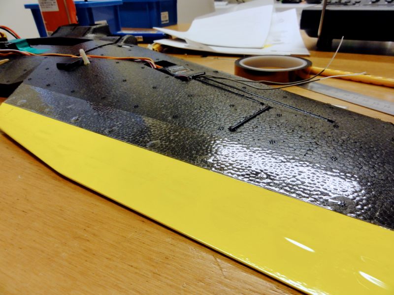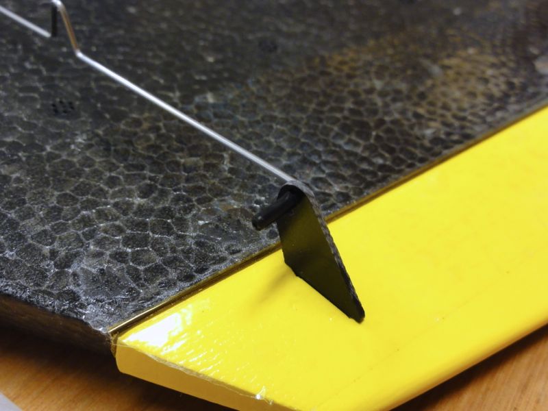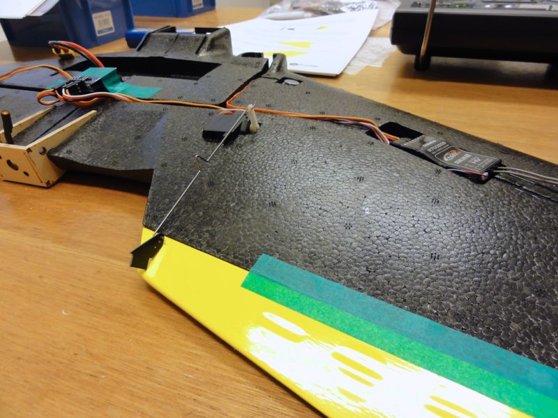 さて、Caipirinhaにもいよいよエレボンを装着。仮止めして位置を決め、ホーン類を接着していきます。サーボニュートラルが左右で微妙に違いますが、メカニカルな調整ができないのでサブトリムであわせていきます。機体上面側は梱包用の透明テープをヒンジ代わりに、背側はカプトンテープで固定することにしました。仮止めしてから位置決め。100均の梱包テープでヒンジ代わりにします。