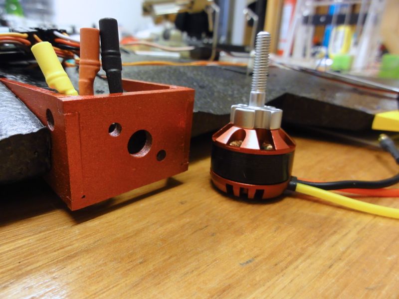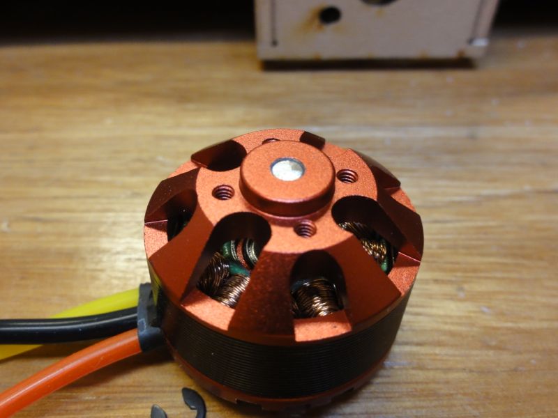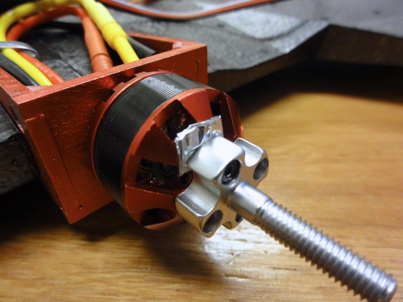 続いて到着したばかりのモーターを装着。SCM2809の1800KVモーターです。シャフトが邪魔なのでさっくりカットし、モーターマウントへ装着。モーターマウントはベニヤでできていますが、木地のままだとカッコ悪いのでモーターと似たような色に塗装。このモーターの精度は値段なりなのですが、プロペラアダプターの精度は更に悪く、芯出しすることに。ヘリで培ったアルミ箔シムをかませてブレの少ないところで固定。ずいぶんマシになりました(^^)/左:シャフトをぶった切ってしまいます。 右:木地のままのマウントはいまいち(笑)
