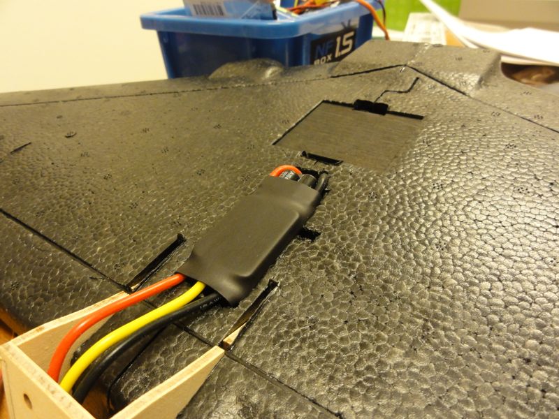 今日はCaipirinhaを少し組み立ててみました。肝心のモーターが一向に届く気配なく、完成はまだ当分先になりそうですがとりあえずESCを配置しました。ESCはDiscoProにも使っているTurnigy MultiStar 30A BECです。飛行機用のESCもあるのかもしれませんが、スロットルレスポンスも良いし30Aもあれば十分かと。置き場所に難儀しましたが、結局機体裏側に埋め込み。ESCからの配線は長さが長かったり短かったりで、適当な長さにカスタマイズしました。