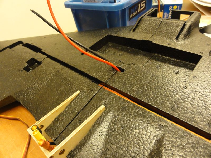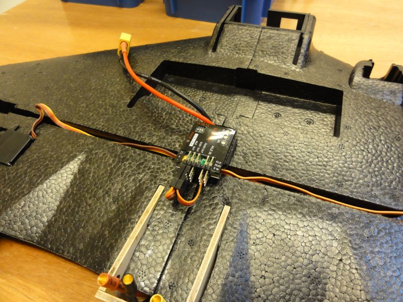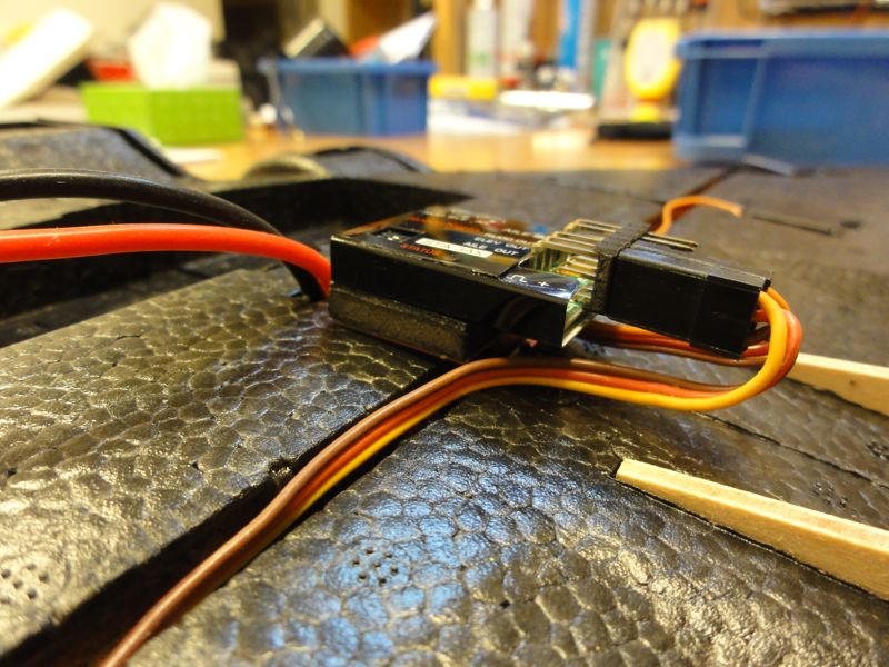 また、ジャイロを搭載。この機体はラダーのないいわゆる【エレボン】機ですが、フライングウイングのモードが有るジャイロじゃないと使えません。手持ちのOrangeRXでも良かったのですが、ちょっとかさばるのでSTA-3AXというジャイロにしてみました。特価で1500円也。このジャイロのすごいところはAVCSが付いているところ。おそらくファンフライ向けなんだと思います。また、配線を極力少なくするためか、エルロン以外の入力は信号線のみとするという特殊仕様。ピン数も少なくなり軽量化に役立ってます。ジャイロを機体に直付けしちゃうと配線が難しくなるので3mm厚のベニヤで少し浮かせました。少し浮かせて配線処理をきれいにしようと画策中。