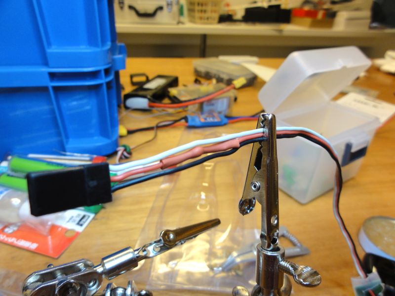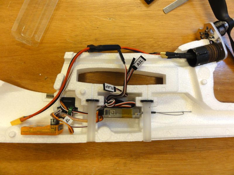 胴体が最初から腹を開いた状態なので、メカ積みは結構簡単です。サーボなんかもそのまま使えますが、1つだけ逝っていたようなので新品にリプレース。レイアウトを考えるのが結構難しく、初代B2とはずいぶん違う配線になりました。今後増えるかもしれないメカなどのことも考えると受信機をど真ん中に置くのは少し気が引けましたが、意外に良い位置のような気がするのでこのまま続行です。もちろん、受信機はFX-22とバインドさせておきました(^^)v最初から開腹された状態なのでメカ積みは簡単。レイアウトは…難しい…orz