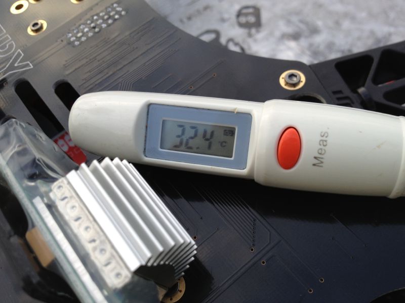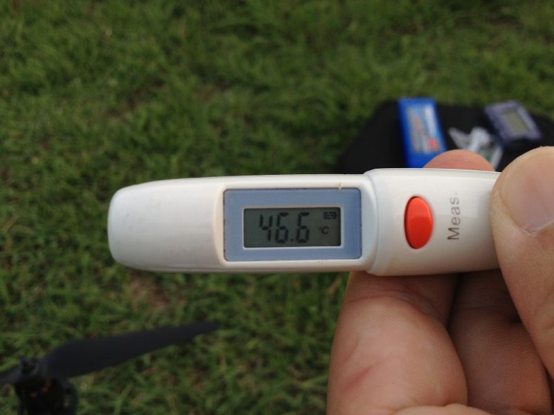 ま、こんな感じで飛ばしてみたところあっさり普通に飛びました。離陸時少し暴れますが、許容範囲かな? 4S 3700mAhで電装負荷をかけつつ7分程度は飛びそうです。着陸直後のESCも温度測定しましたが、40-50℃程度。前回とは比べ物にならないくらいの暖かさです。Coreにいたっては体温程度。やはり過負荷だったのかなぁ…。