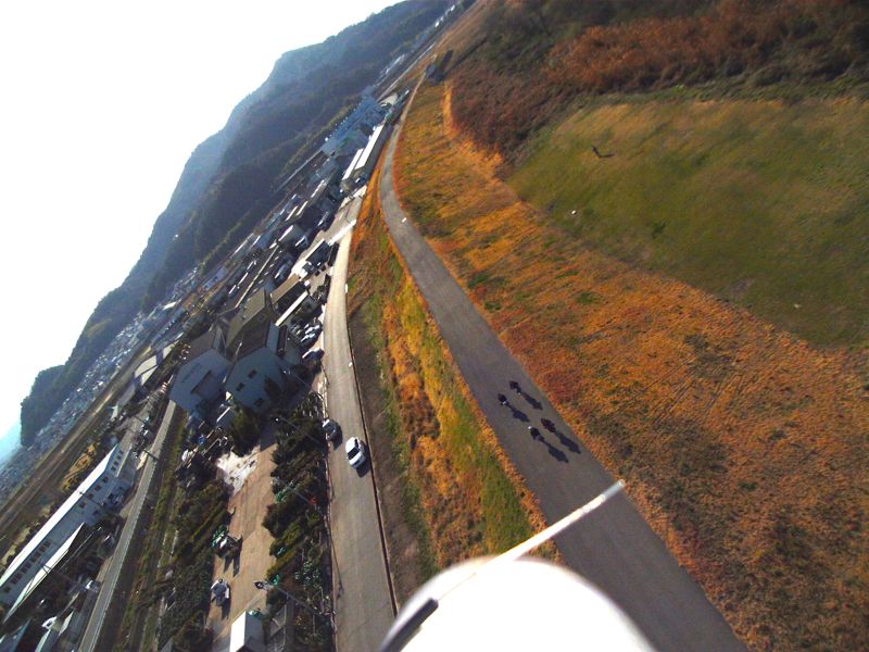 地表風速5~6m/secなので上空ではもっとあるんでしょうね。北風なので機首を北へ向けていれば比較的安定してグライドできるものの、風下に向かえば一気に加速し降下を始めます。まさに風見鶏状態でした(笑)風が強いので北向きなら動力不要でホバリングできるくらい。地表付近では風がグルグル回っているのか、着陸はかなり難しかったですがまぁなんとか無事帰還。途中、堤防上を家路へと向かう女子高生の軍団に遭遇。ちょっとダイブさせてみたら喜んだらしく、【ありがとうございました〜♥】と黄色い声援。手を振って応えておきました。オジサンも捨てたもんじゃないね(笑)