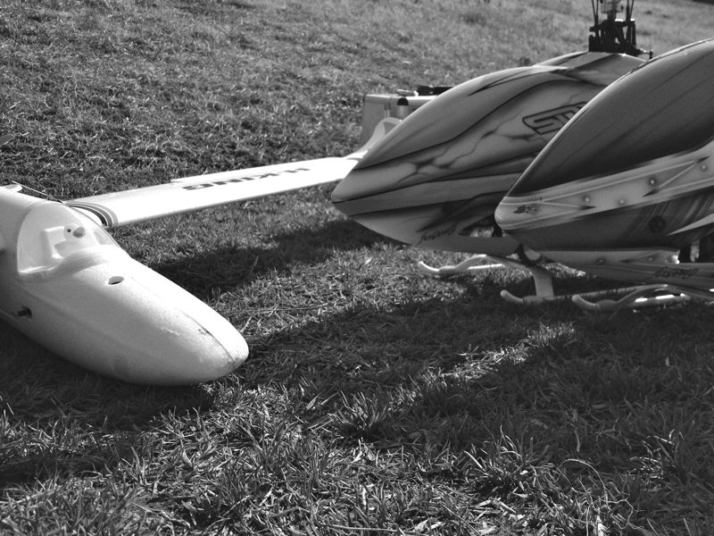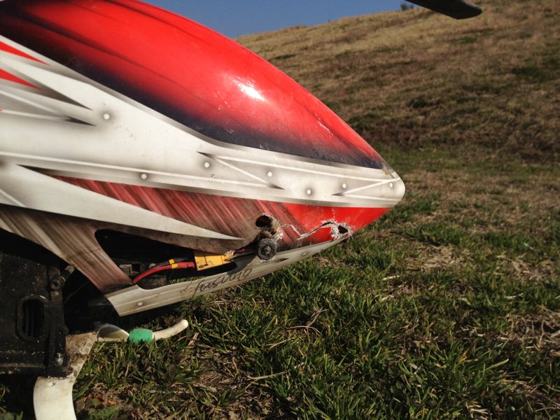 突然のノーコン(*_*; ラダーが全く効きません。幸い10m程度の上空だったので、観念してスロットルカット。HOLDでローター回転を殺して不時着させました。不時着時にバッテリーが飛んだのか、ビーコンの反応もなく捜索は難航しそうでしたが、幸いすぐに発見できました。しかし原因がよくわかりません。一旦駐機場に持ってきて確認してみると