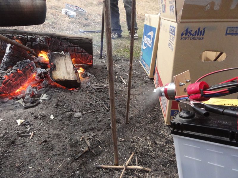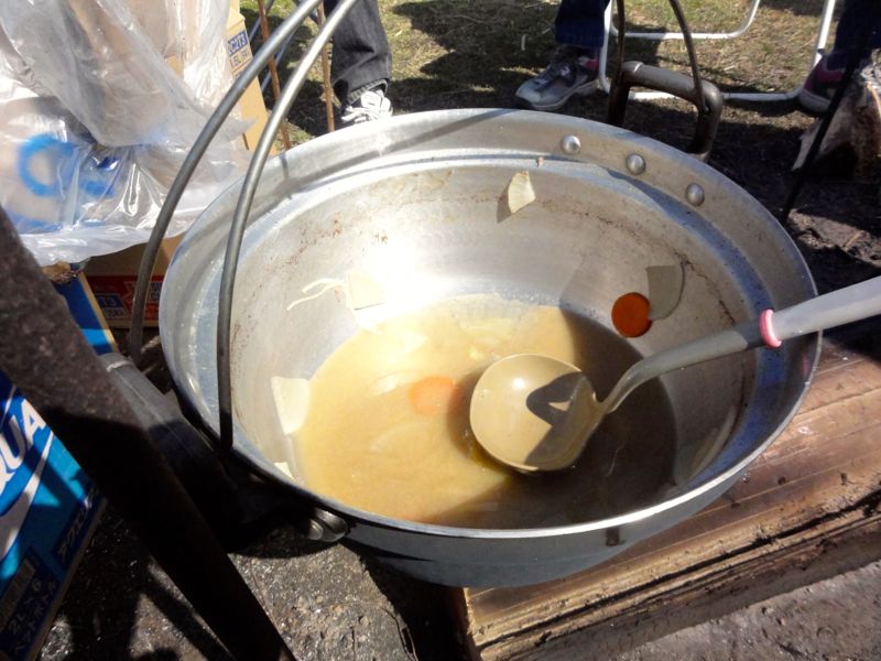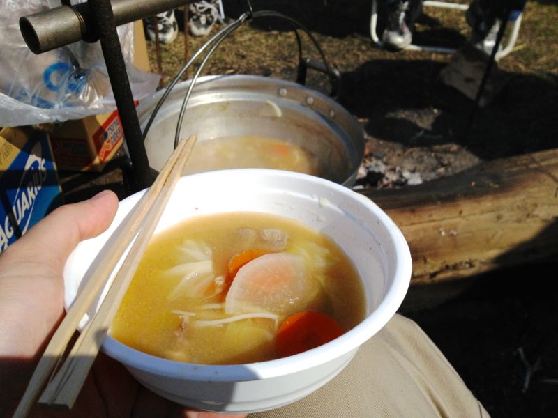 焚き火を囲みつつ、猪鍋が完成。K2さん、いっぱい猪肉を持参してくれました\(^o^)/ 今日は皆さん殆どフライトせず火の番(笑) hatayanさん作成の火おこし器も大活躍し、贅沢に木炭を使ったので火力も安定。お昼ごろにちょうど猪鍋が完成(^^)/ ハフハフしながらいただきました(^o^)