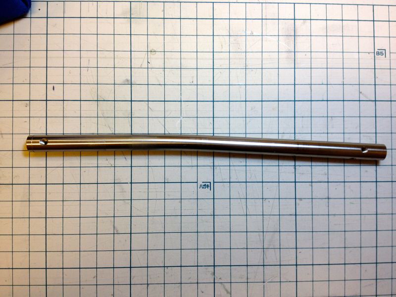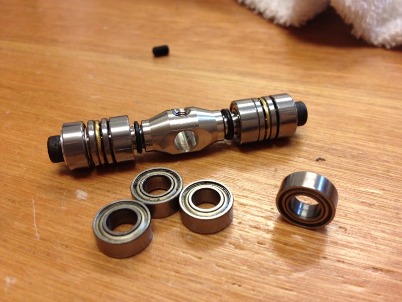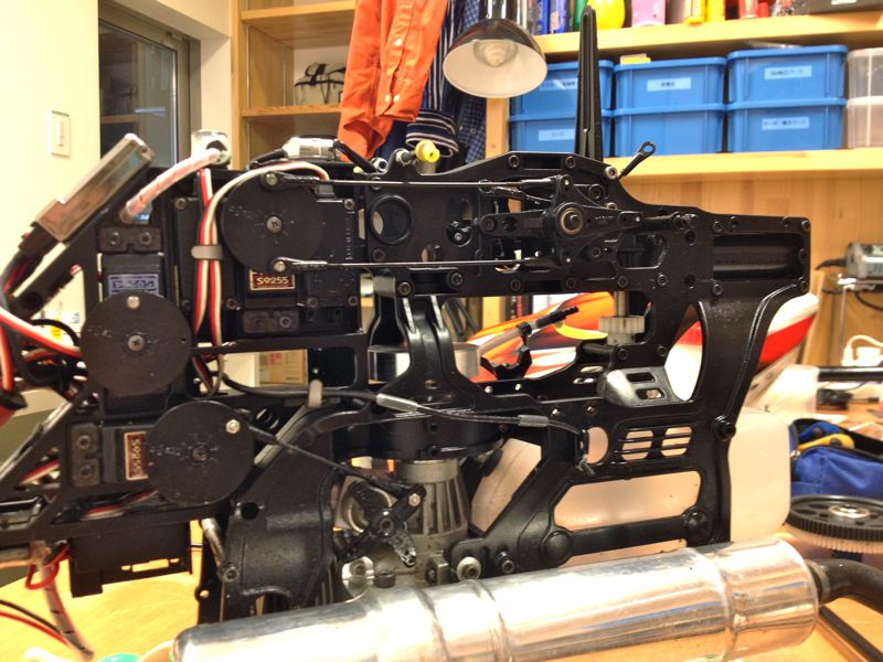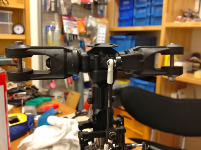 先日背面で真っ逆さまの初号機修理は以外にも順調に終了。それにしてもメインマストは久しぶり の交換。機体から外してみると上下端で約1cmも曲がってました。スピンドルは外せなかったスフェリカルブッシュなどと一緒にゴミ箱へ。スフェリカルブッ シュ・ゴムブッシュなども新調し、周辺ベアリングもガタツキのあるものは交換しました。今回の墜落と直接関係ないでしょうが、テールローターのハブも微妙に曲がっている感じだったので気分良く新調。ベアリングも交換しました。