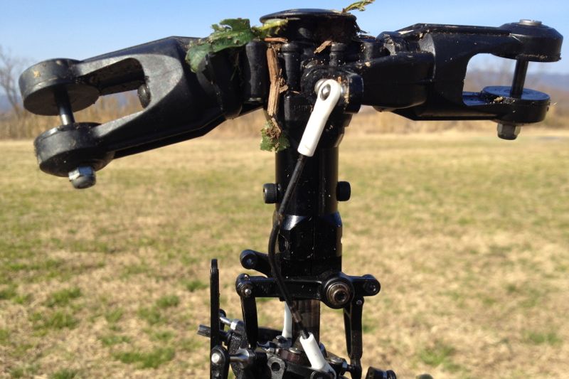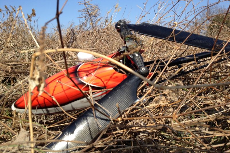 フレームなどは損傷もなかったのですが、ヨークから鉛直方向に衝撃がいったようでマストストッパーもずれてる始末。スピンドルは激しく曲がりSSZ-IVのダンパーゴムやスフェリカルブッシュも外せなくなりお釈迦に。テールパイプは若干の曲がりを認めますが、前回のこともありおとなしく交換することにします。ブレードやキャビンなんかはぜんぜん大丈夫そうなので、まさに真っ逆さまに落ちたという印象。ローター回転がほぼ死んでいたのも不幸中の幸いでした(^^;;