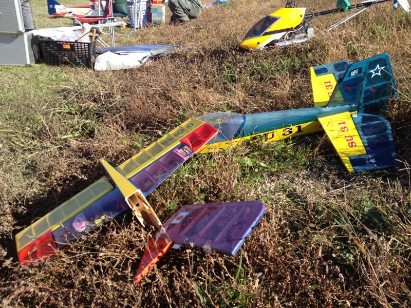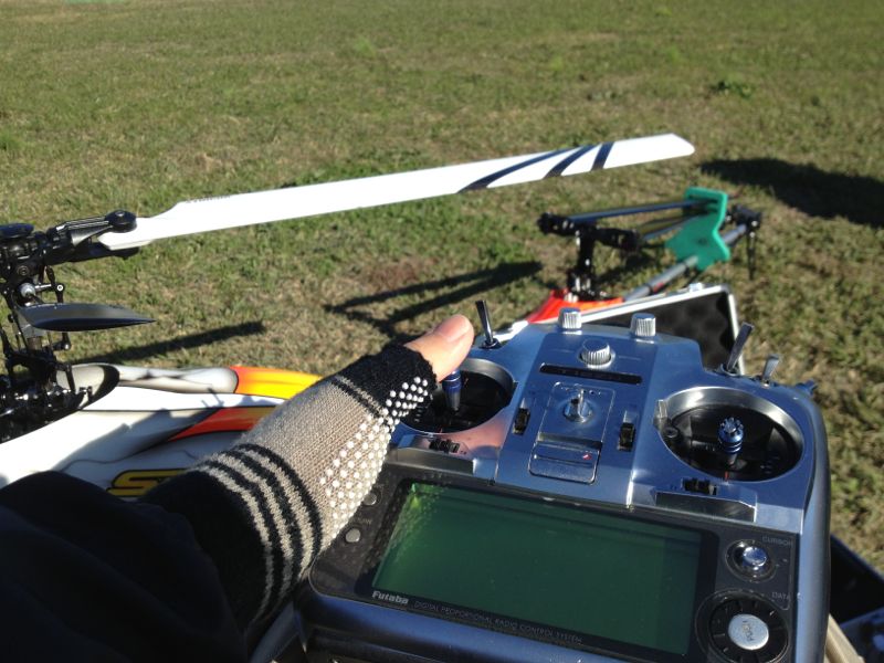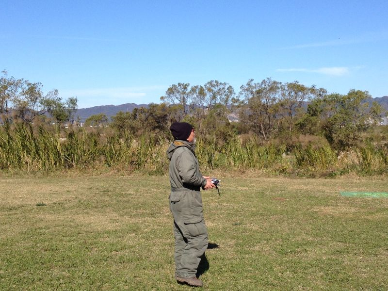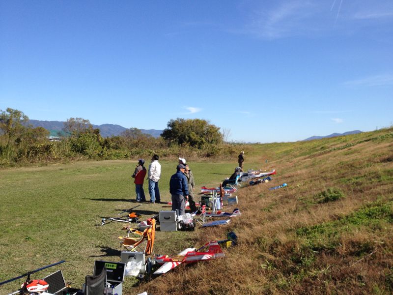 先月28日以降、日曜日には飛ばせていなかったのですが久々の日曜日に出動。これまたいいお天気で最高でした。朝は風も強かったものの、次第に無風近くになり正午頃には暑く感じるほどでした。 そんな中、初号機1F、弐号機2Fをフライト。代わり映えのしない演目ですが、落とすこともなく無事に終了しました。ヘリ組は飛行機組に押され気味なのでちょっと寂しい感じ(^^;;