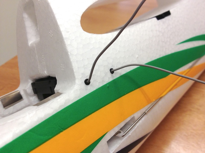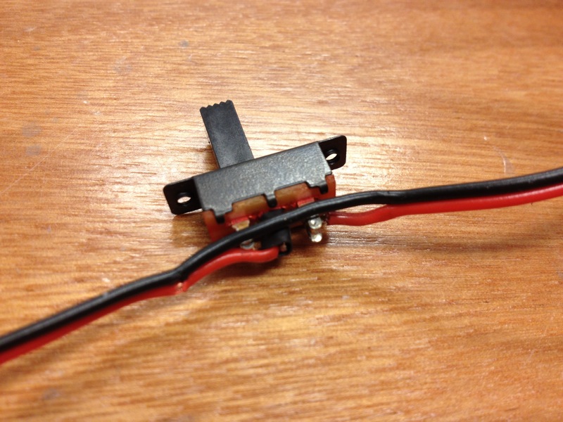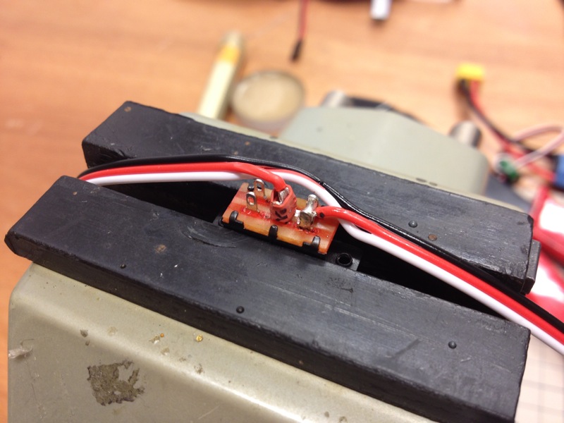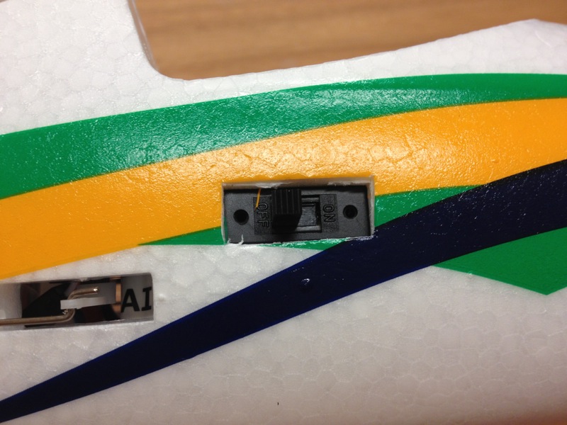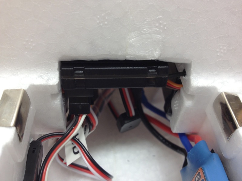 以前から欲しかったのがスイッチです。Bixlerより胴体内部の空間が大きいのでバッテリをつないで放り込む分には問題ないのですが、あれば便利かな、と。電源はBECから取っていますのでスロットルの信号線分を追加。GNDとVCCだけのコネクタではスロットルが動きませんです(^^;;