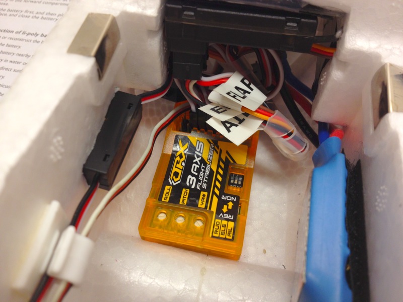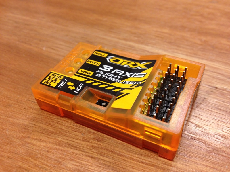 以前はクアッドジャイロを書き換えてOpenAeroで運用していましたが、今回はOrangeRX社製の3軸ジャイロを搭載してみました。コンパクトでケースもあり、安いこともあって評判は良いようです。ゲイン調整はマニュアルなので、すべて0にすればジャイロ無しと同じとなります。こればっかりは飛ばしてみないとなんともいえません…。