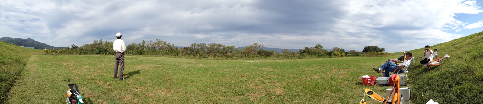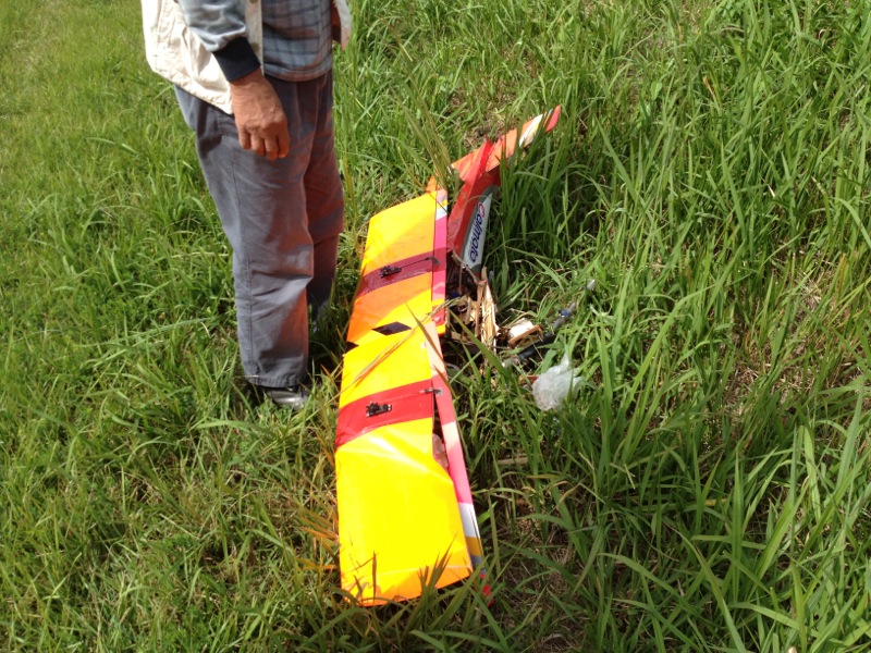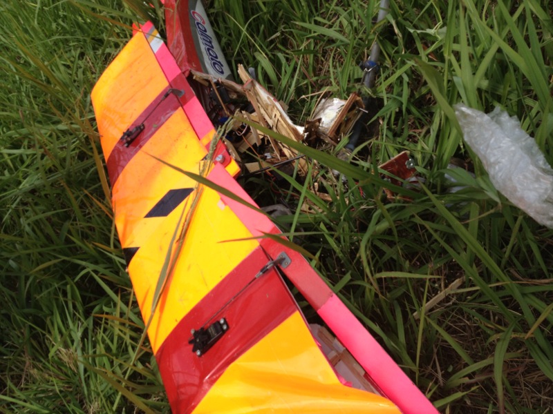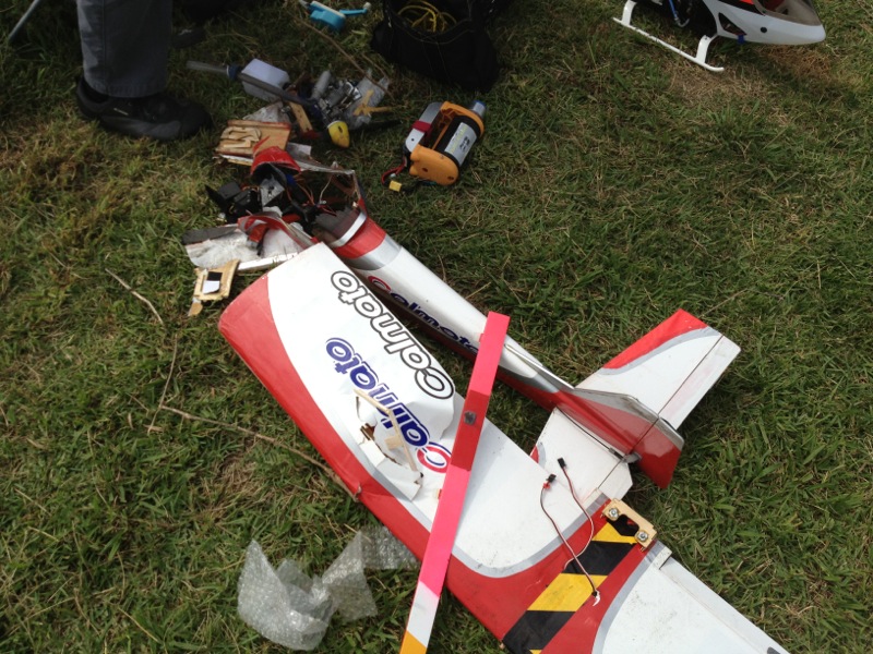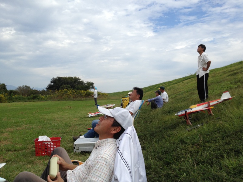 hatayanさんはカルマートの背面旋回中に墜落。エレベータのサーボギヤが欠けていましたがこれが原因かどうかはわかりません。土手に向かって一直線に落ちたようで機体は木っ端微塵。メカやエンジン類は大丈夫でしたが、機体はすぐに荼毘に付されました…。 これくらいのお天気が続くといいんですけどね(^^)/ 明日も飛ばしに行きますp(^^)q