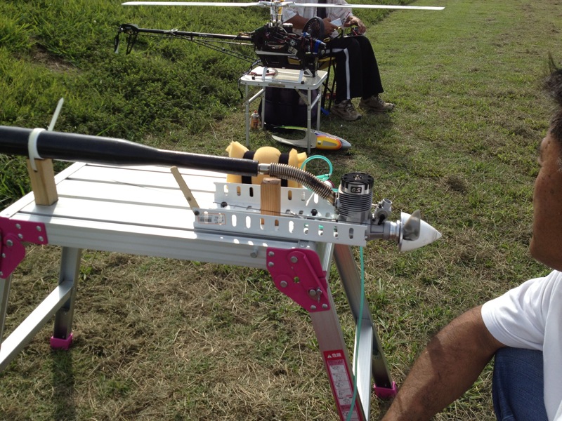 僕は初号機2F、弐号機2F。しょっぱなからエンジンのかかりが悪いなぁと思ったらスターターのバッテリが切れかけ。幸いエンジンの調子はまずまずだったのでなんとか始動はできましたが4F終了後にはどうやら力尽き果てたよう。LiPoにするかALIGNのスターターでも考えてみましょうかねぇ…。ちなみに初号機は1F目のオートロで最後パタンとこけてしまいましたが、ピッチロッドがちょっと曲がったくらいでなんとも無さそうなので2F目に突入。今思えばこれが失敗のもとでした…。