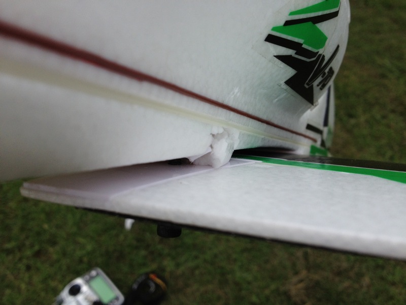 仕事帰りにちょっと飛行場へ。先週と同じでお天気はさっぱりですが暑さは一段落。初号機1Fと、Zephyrを飛ばしました。Zephyrは久しぶりに飛ばしましたが機速があるので、その分舵が一気に効く感じです。曇り空なのでシャープな機体はすぐに見えにくくなり、危うく舵を打ち間違えるところでしたがなんとか帰還。1Fたったの2分ちょっとですが膝はガクガクです(笑) 2F目にもチャレンジしましたがハンドランチに失敗、地面にゴッツンコしてしまい主翼付け根部分がご覧の有り様。雨もぱらついたので撤収しました。Zephyrはかなり難しいのでBixlerなどで固定翼の練習をしないといけないかも。もうちょっとイージーな機体を飛ばしたいところです。 さて、修理がてらvaioさんがバーレスSDXの貴重な設定を公開してくださっているのでちょっと比較してみようかと思っています(^^)/