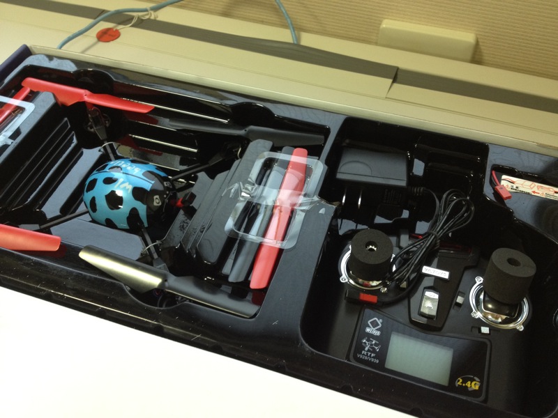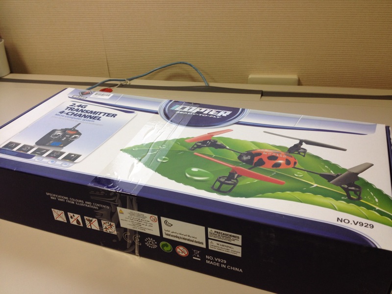 空モノとしてすっかり定着した感じもあるマルチコプターですが、マイクロクアッドだとインドアで楽しめるWALKERA社のQR LadyBirdが結構人気のようです。しかしさすが中国四千年の歴史。すでによく似たものがわずか3000円くらいで売られているので、ものは試しに購入してみました。 箱に印刷されている名前はICOPTER。WLTOYS社の製品です。V929、V939の2種類がありV939はLadyBirdのコピー品のよう。今回は少し大きめのV929です。単三乾電池が6本あればすぐに飛ばせるようになってます。