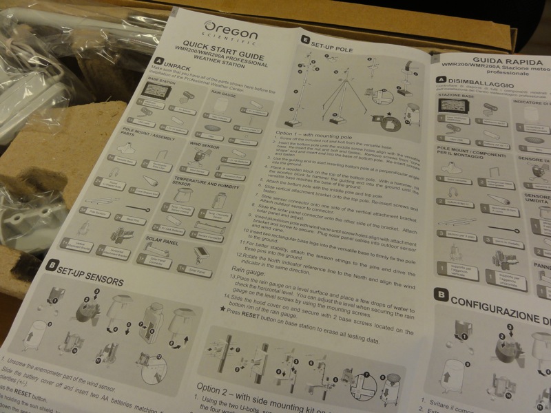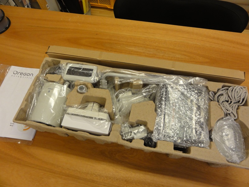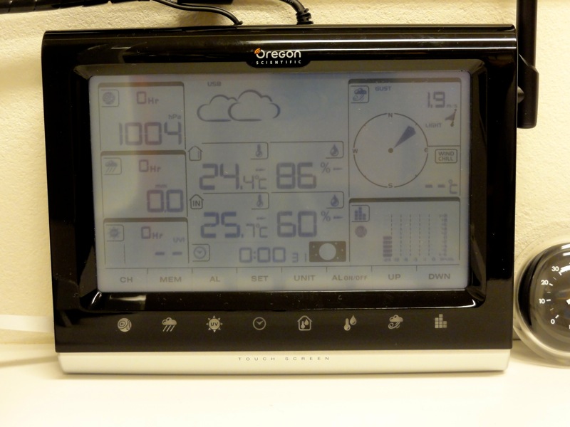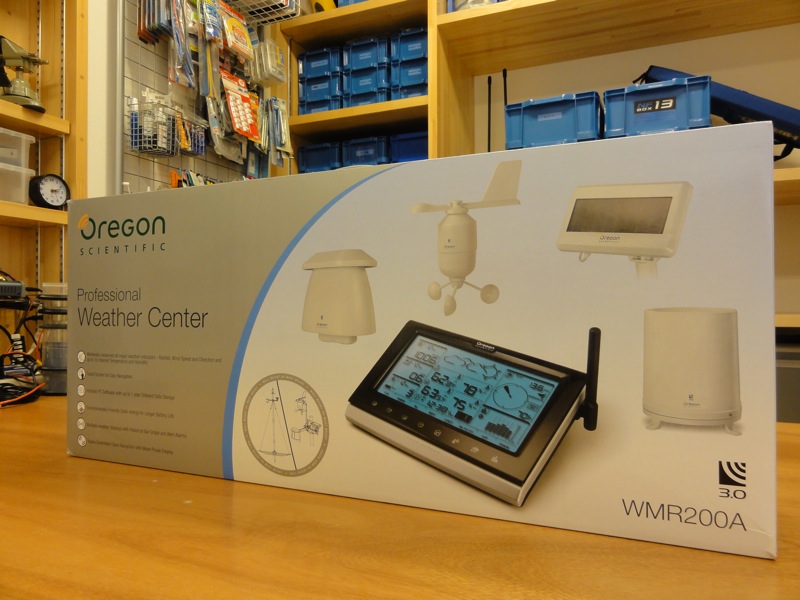 もう何年も前から、家を新築したらぜひ導入したいと思っていた気象観測装置。昨年やっと家を建てたのですが、なかなか導入できずに随分日がたってしまいました。今回、円高の波に乗ってOregonScientificのWMR200Aを米国のAmazonから購入し導入してみましたのでちょっとレポ。 マニアな方はDavis社のVantageProなんかを選ぶんでしょうけど、ほぼセミプロ仕様で価格も高めなのでお手軽でコンソールもかっこいいWMR200Aを選びました。 箱は大きめで、中はぎっしり。ちなみに米国Amazonの梱包は日本のAmazonと違い、結構いい加減でしたのでご参考までに(笑)必要な部品は全て入っており、用意するのはドライバーくらい。このセットで屋内外の気温・湿度、屋外の気圧・風速・風向・雨量がわかります。単三および単四のアルカリ電池が付属していますがMaxellブランドだったのでちょっと嬉しい(^^)/ 取説には日本語はなく、英語(その他、イタリア語・フランス語・ドイツ語・スペイン語・ポルトガル語・オランダ語・スウェーデン語)だけですがそんなに難しくはありません。ポールを組み立て、観測機器をセットし設置すれば完成です。風向計だけはきちんと北側に向ける必要がありますが、至って簡単。きちんとした観測業務を行うなら設置場所もきちんと考えなくてはいけないのですが、趣味の範囲ですのでこんなものかと(^^;; 雨量計は転倒ます型。雨の跳ね返りが少なそうなところを選んで設置します。 室内に置くタッチパネル式のコンソールはUSB出力ができるので単体でもPCでもロギングができます。これは結構大きくて、ELバックライト付き。夜間でも視認できるようになっています。