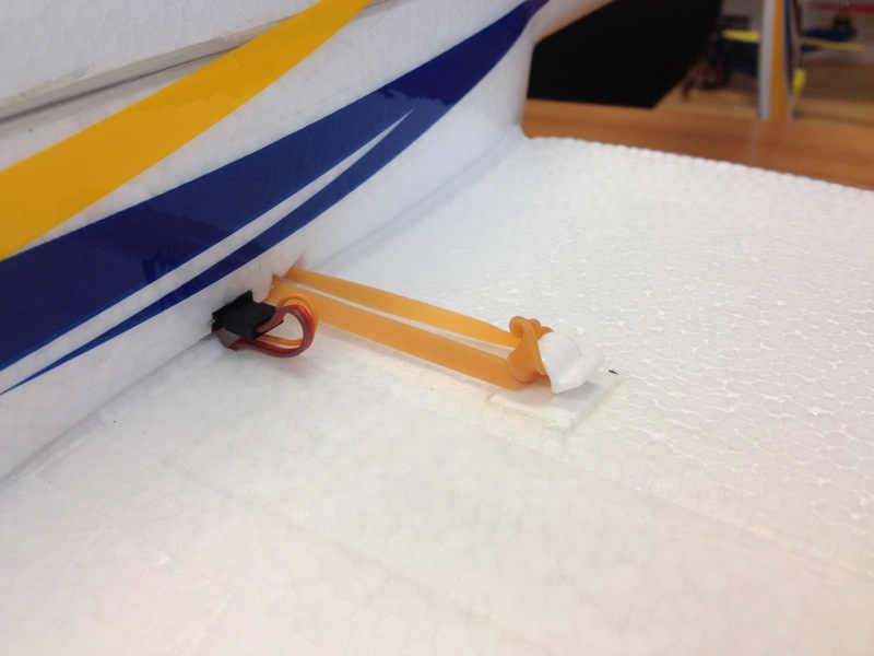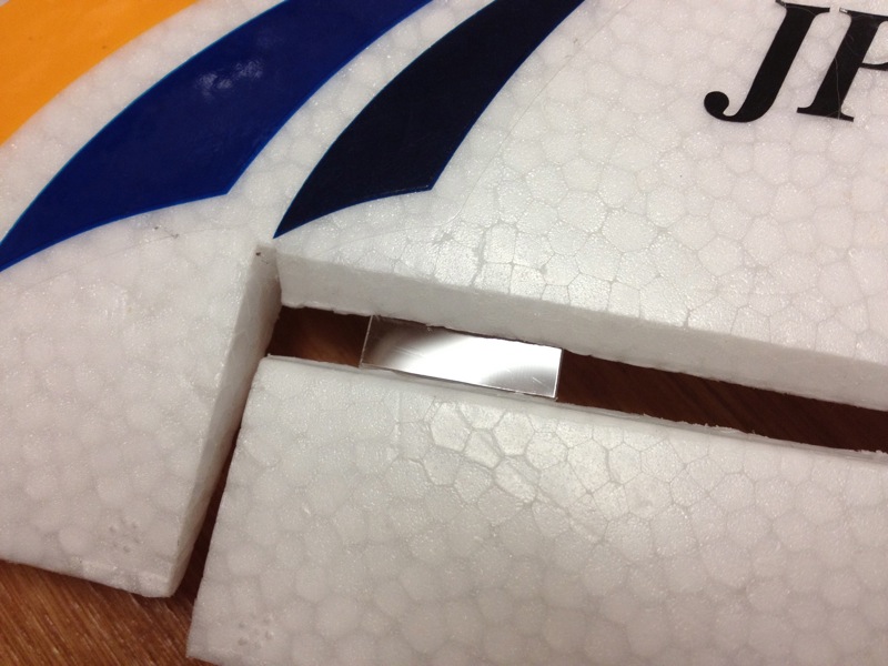 先週末のフライトでエレベータフラップのヒンジ部分がちょっと欠けてしまったので、フラップを離断しヒンジを新たにPET樹脂板で作り直しました。