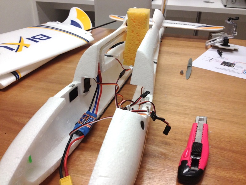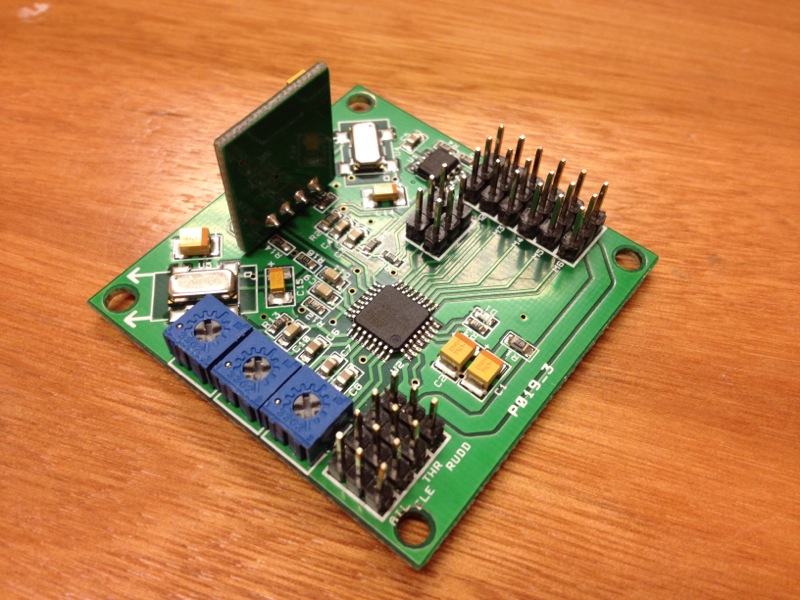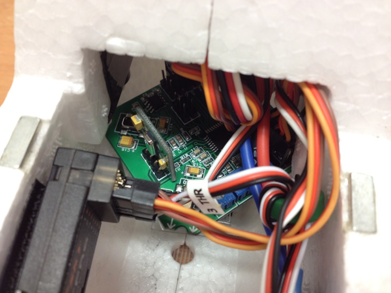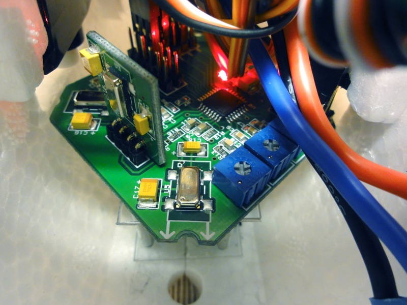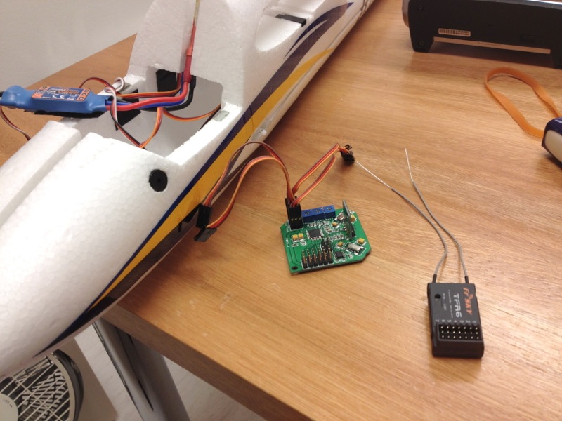 先日来、癒し系のBixlerに凝っていたりするわけですが機体が軽く、ウイングスパンもままあるので結構風に乗ってしまうのが長所兼短所。海外のロケーションは結構いいとこばかりみたいですが、残念ながら海に近く山も迫っている当地では強風はザラ。落としそう、とまでは思わないのですがもう少し安定感が欲しいのは事実。CrazyHorstさんみたいにハンドキャッチするなら尚更で、手放しでも水平に飛ぶ機体に仕上げたいと思いました。ちょうど、どうやってもうまく行かなかったホビキンの3軸ジャイロがあるのでこいつを使ってBixlerに載せようと画策しました。 海外にはOpenAeroというプロジェクトがあり、KK multicopterボード上で走る飛行機制御システムを開発しています。OEM?コピー品?のホビキンボードもおそらく使えるだろうということで早速OpenAeroのファームウェアに書き換え。V1.08ではうまくいきませんでしたが、V1.11ではなんとか動作。取説では1・2・4番の出力がラダー・エルロン・エレベーターとなっているのですが、なぜだか僕のボードは2・3・5番にアサインされています。ジャイロオン・オフの切り替えはトグルスイッチで動作させ、THR入力へ接続します。 MEMSセンサではなく、一般的なピエゾ素子なので若干かさばりますが基盤の端を切り落としてなんとか中へ搭載。ヘリみたいにジャイロが働かなければ即墜落、というわけではないのでみなさん結構適当に載せているようです。 ジャイロをOFFにすれば普通の動作、ONにすれば水平方向への当て舵を打ってくれます。リモートゲインなんてありませんので感度はすべてポテンションメータで調整。Rollはロール軸とピッチ軸の感度、Yawはヨー軸感度で基本は50%前後から調整。また、Pitchポテンションは使わずにMin.の状態に設定せよ、とあります。