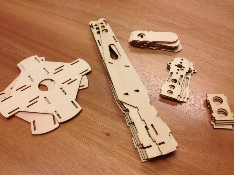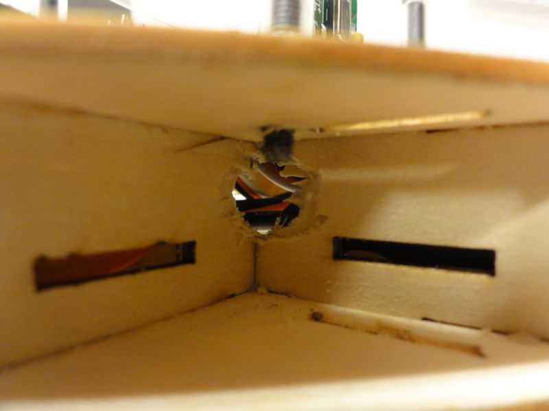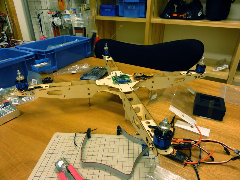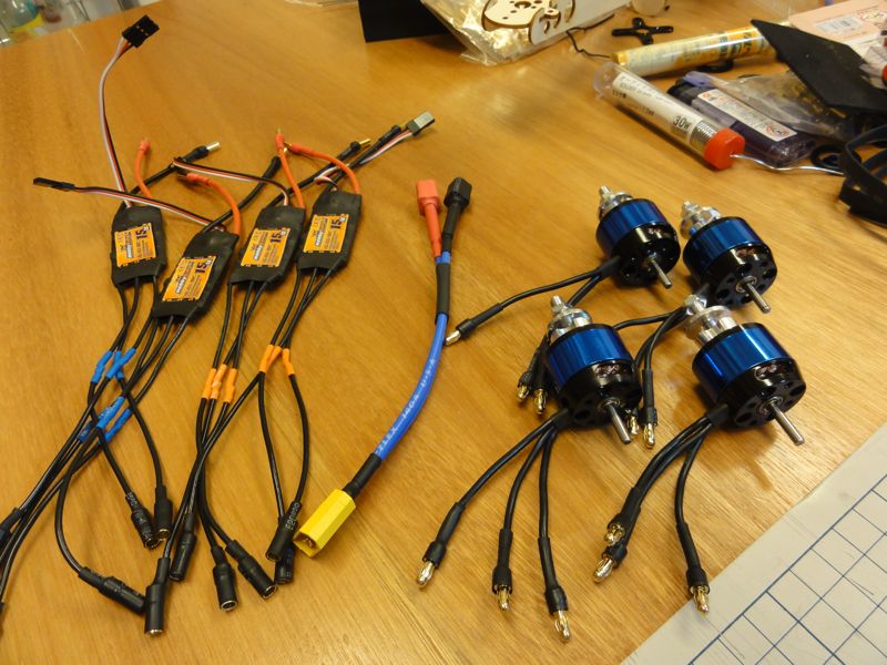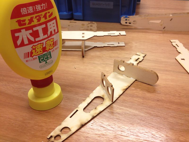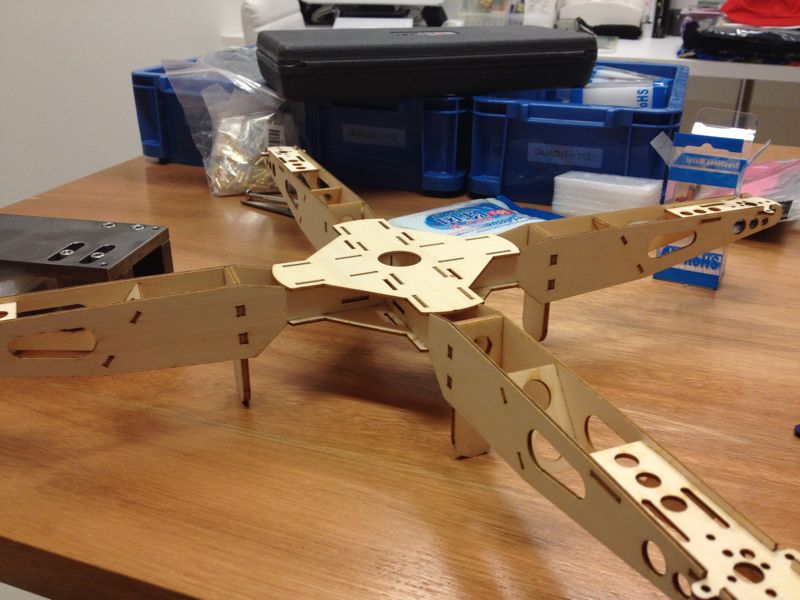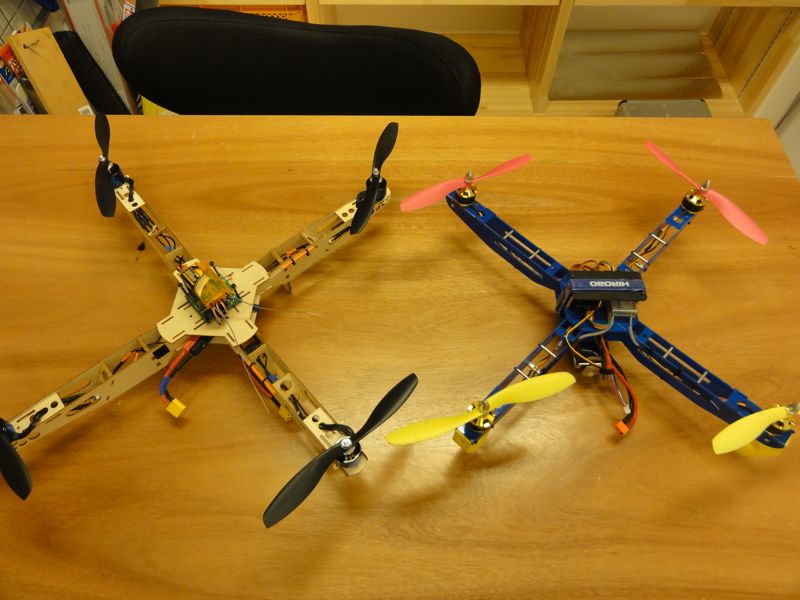 GAUI330Xを購入してすでに1年以上。空撮の真似事などしてきたのですが、意外に面白く【癒し系】フライトができるので予備機を作成しようと画策。電動は今でもさっぱりわからないのですが、とりあえずなんとかなるでしょ、とかるいキモチであちこち見て回りました。安く作ってみたいのでジャイロはホビキン製のQuadController V2.1を選択。フレームやアンプなどすべてホビキンで揃えました。買ったのは去年の夏、というのは内緒です…(笑) フレームは格安のベニヤ板仕様(笑) 木工用ボンドで接着するはめ込みのみのタイプです。組立は慣れたら30分もあれば終わるほど簡単なのですが、これがのちのち色々後悔することに…。 さて、Quadの脳味噌とも言えるジャイロはKKmulticopterのコピー品?のようで、ファームウェアの書き換えで+やXタイプ、またトライコプターやヘキサコプターにもなるものです。今回は飛ばしなれたXタイプのファームウェア、QuadControl V4.7を選択。書き換えはUSBaspというインターフェースを用いれば比較的簡単です。 モーターは素人にはなんだかよくわかりませんので"hacker Style Brushless Outrunner 20-28M"という、1000kv前後のとにかく安いやつを選択。1個1000円ほど。ESCはHK製の15-18Aです。これは1個500円くらい。 ヘリと違ってサーボもないし、ひたすら組み立てて配線するだけ。ただし、配線は汎用性を必要とするのか端子は全て自前で製作しなければいけません。ハンダゴテで数十箇所におよぶ端子を無心にはんだ付けします(^^;; さらにコントロールボードにも配線がないので、こちらもサーボリードを使ってコネクタをひたすら制作。ラジペンでやるにはあまりに失敗が多いので思い切って精密圧着ペンチを導入。思いっきり楽です(^^)/ さて、あとは出来上がったパーツをフレームに取り付けます。が、ここで問題発生。先に作ったフレームは接着してしまっているのでバラすことができません。おまけにどうしても配線を通したい部分がふさがっています。設計上仕方ないのでしょうか?嘆いていても仕方ないのでドリルで穴あけ。ま、ベニヤ板なので加工は至極簡単。バリも多いですが気にせず続行です(^^;; モーターの配置はファームによって決まるのですが、説明書通りだとどうもうまくいきません。あ〜だ、こ〜だ、と悩みながら試行錯誤の連続です。説明書も含め見つかる文献はほぼ英語のみなので大変です。やっとの思いで完成した機体を先ずは庭先で浮かせてみます。 …が一瞬でこけてしまいフレームの一部を破損。やはりベニヤ板は転げたら一瞬でパーです(^^;; とりあえず予備フレームの部品を流用して補修しました。みたところどうも舵があっていないようです。玄人向けジャイロなので、起動も難しいです。スロットルを最低にした上でラダーを右に切ることでスロットルが反応するのですが、スロットル0ではダメで(僕の12Zの場合)、トリムで-10ほど与えないと反応しません。そこでスロットルカーブ1ポイント目はマイナス領域です(^^;;