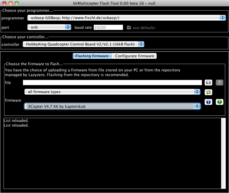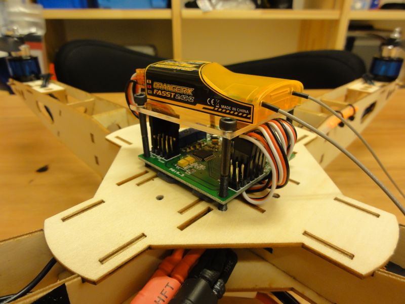 補修後も悪戦苦闘していますが、どうにもうまくいきません。ペラを外してモーターの回転を見ていますが、スロットル・エルロン・ラダー、そしてジャイロの反応方向も(なんとなく)正しいようです。唯一例外なのがエレベータ。エレベータスティックをダウン方向へ打てば本来前方のモーター回転が下がり、後方のモーター回転が上がるはずですが、すべてのモーターの回転が下がってしまう始末。う〜ん、ファームウェアが間違っているんでしょうか…。それとも配線…?