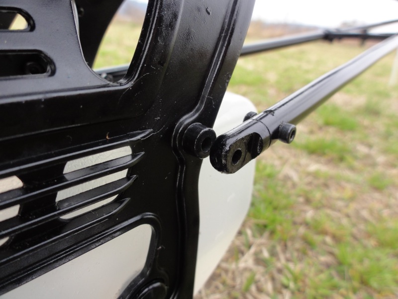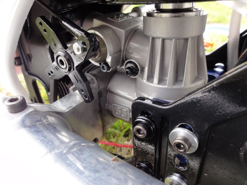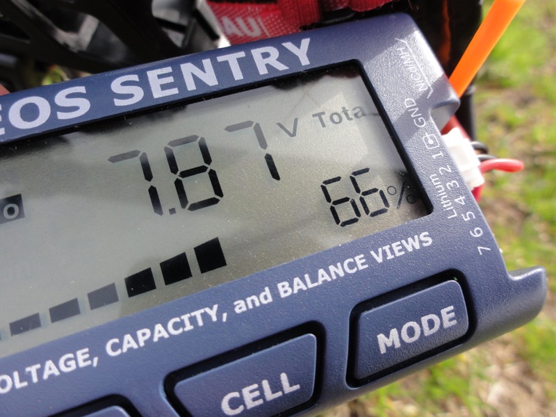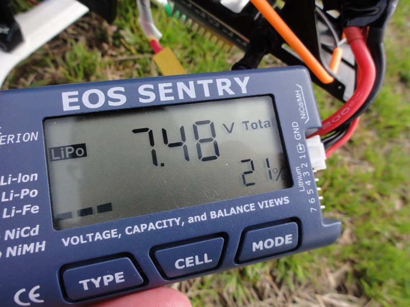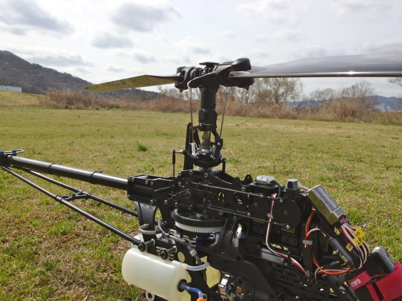 そして背面へ。ところがダウンフリップでエレベータが思った以上に効き、あやうくその場で回ってしまいそうに。高度があったのでなんとか耐えましたがこりゃ効き過ぎです。EXP入れないと…。バーつきの時は【よっこいしょ!】っという感じで回りましたが、バーレスは【クルンッ!】と回ります。エルロンも同じ。ロールレートがかなり上がっていてびっくりです。 最後はHOLD。バーレスなので大丈夫かなぁ…と思う瞬間です。HOLDへ入れて直線オートロさせましたがこれまたいつもの感じでした。無事でよかった(^^)/ 噂には聞いていましたがバッテリ消耗はかなり早く、1300mAhリポは調整フライト約10分近くでほぼ80%近く消費。地上に降ろしてアイドルさせていた時間も常にスワッシュが動き続けるのですから、まぁ、当然といえば当然でしょうか。上空のみ4分で約30%の消費でしたが、激しく動かすなら5分が限界かと。マージンを取って1300mAhで1Fと勘定しますかね。一応4本あるので現地で充電しないとなれば4F/日、まぁ十分でしょう(笑) 帰りに機体をざっと清掃したのですが、案の定テールブームブレースの根本が外れていました。ラダーが落ち着かなかったのはこのせいだったんでしょう。あと気になったのがマフラー側の機体の汚れ。やたらオイルでテカテカです。排気漏れしてるのかな?かえって点検と調整です(^^)/