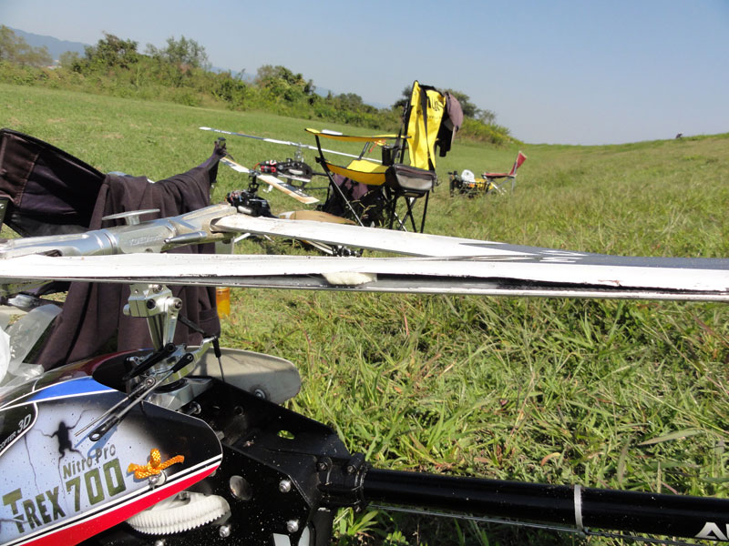 そんな中、久々にカメラだけ持って飛行場へ出向き偵察してきました。お天気もよく、格好のフライト日和です。飛行場には撤収間際のhatayanさん、JYALAさん、K2さん、そして半年ぶりだというEさんが。K2さんの700N用ベニヤ仕様バーチカルフィンはすでに壊れてましたので墜落してしまった様子…(;_;)