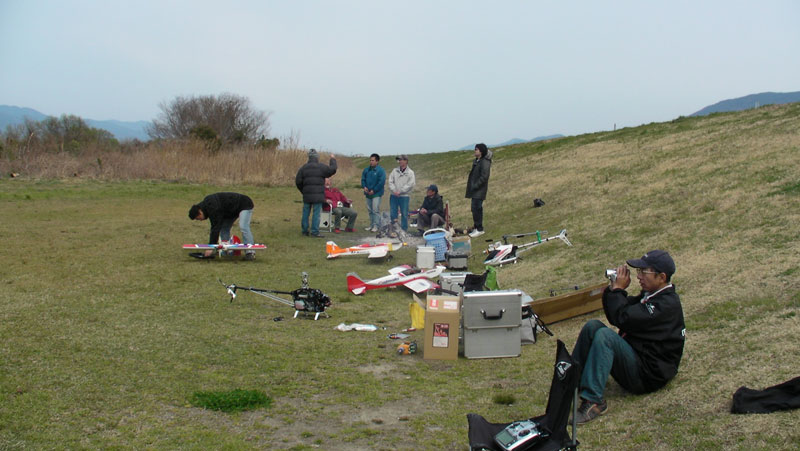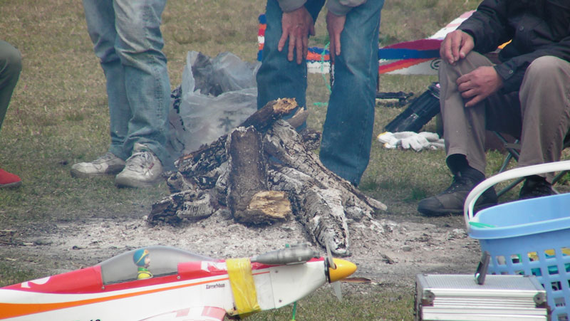どう考えても4月とは思えない寒さ&強風。こんな日は人出もまばら・・・と思っていたら飛行場には結構な人数が。物好きばかりですなぁ・・・。あまりに寒いので野火で暖を取っていたのですが、春だからか風向きがいつもと逆。待機場に向けてかなりの降灰がありました。風は強いし煙は目にしみるし寒いし、で結局弐号機を2Fで終了。GAUIもこんな日には飛ばせません。ダラダラと昼過ぎに撤収です。 帰ってからあまりに煙りくさいHIROBOジャンパーを洗濯。ところが、干そうと思ったときポケットからゴロン、と送信機バッテリが・・・。死にました(涙)