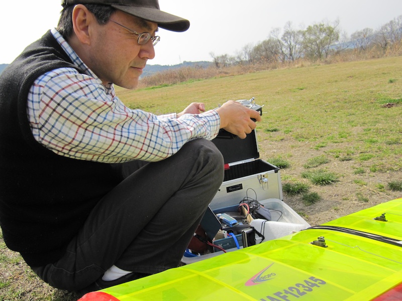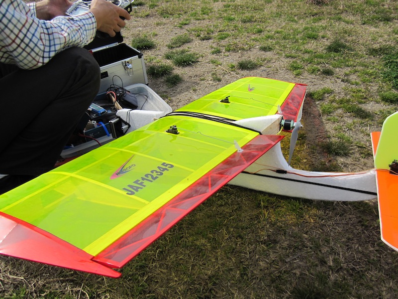 早速飛ばしていただきましたが、テールヘビーの様子。それでもトリムやなんやかやを調整し結構いい感じに飛んでいました。風がそこそこあったので若干パワー不足でしたが、今後の改良に期待です。ここで動画がご紹介できないのが残念ですが、高度も高くとれるのでなかなか面白い画が撮れていました。