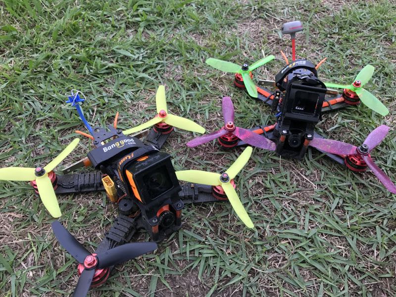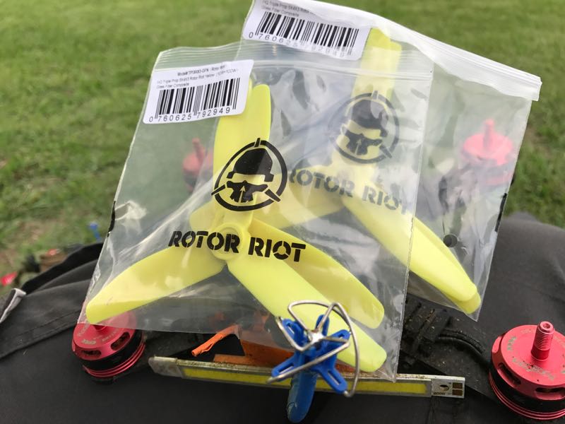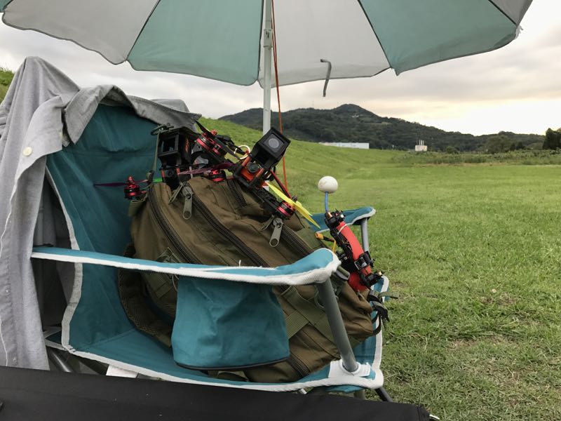 Swiftは初っ端からピットに向かって離陸させてしまい激突。右腕の切り傷が発生。A号機は低空でのりカバーができず転がってしまい、挙げ句の果てにはVTxのキノコ部とペラが接触しペラが折損。B号機はバック時に低空過ぎてブッシュバンプに引っかかる始末。幸いロストはありませんでしたが、フライト時間以外に随分時間が取られました。ペラを部分的に交換していくと、どんどんカラフルになります(笑)