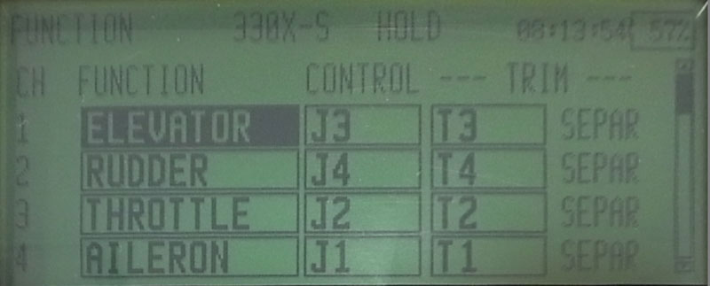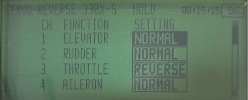 続いてサーボリバースの設定。Futaba系はTHRがリバースになるのかな?とりあえずTHRのリバース設定だけは確実にしておきましょう。下手すると大惨事になります・・・(^^;;