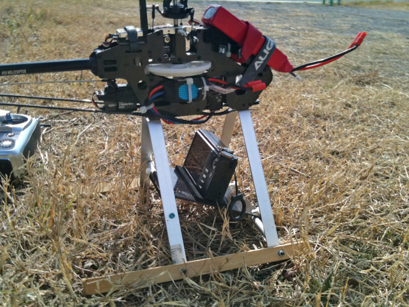 今回飛ばすのは先日来拝借しているT-REX450 PRO。スキッドをJYALAさん作のお手製ジンバルに換装します。揺れを吸収するような凝った造りではないのですが角度的にはなかなかいい感じです。ビデオカメラを積もうかとも考えましたが、僕のXactiはちょっと積めなさそうだったのでRICOHのCX-3を積みました。こいつは5秒単位でのインターバル撮影が可能です。ピントは無限大にし、撮影間隔を5秒に設定。早速フライトです