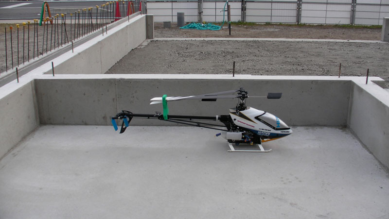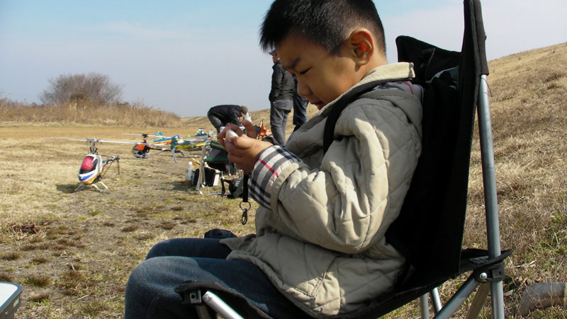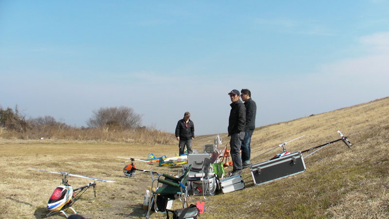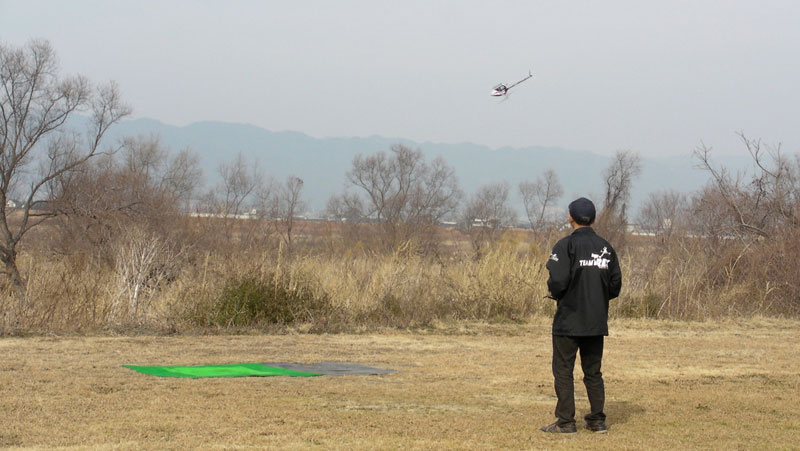 T-REX450は初めての電動機。スイッチの入れ方すらわからないので(バッテリを結線するだけだそうで)ひと通りレクチャーを受けてからのフライトです。3分で切り上げましたが、かなり怖い