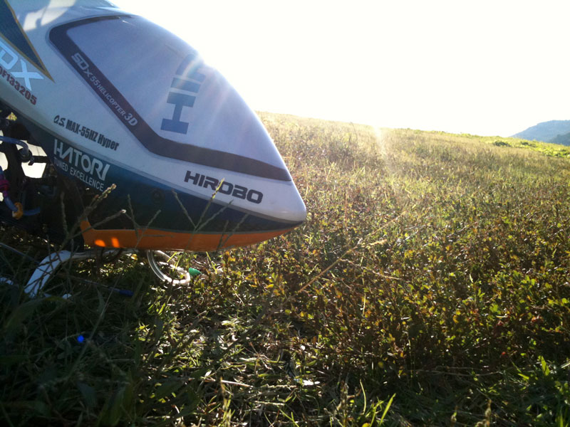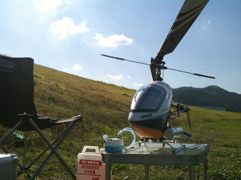 3タンクほど調整を兼ねフライトしました。ピッチが若干マイナスへ振っている感じだったので±14°程度取れるようリンケージを調整。以前は−16°〜でした(笑) ローターは620mm、ちょっと重めなので派手に振り回すには大変ですが安定したフライトができました。また、チクタクなどを繰り返してもヘッド温度は100℃未満で収まっていました