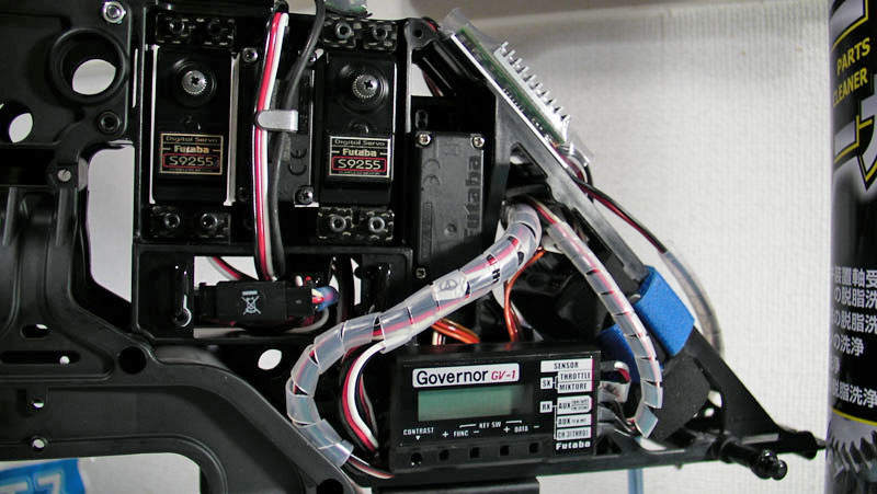 から帰ってきて復旧作業再開。エルロンサーボが上下逆と指摘されましたのでまずはサーボの配置し直し。その後、あ〜だこ〜だと悩みつつ配線処理。また、レギュレーターのリード線が長かったり短かったりしたのでハンダし直したりといろいろ作業