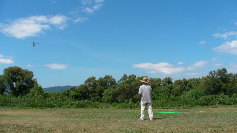 JYALAさんはT-REX700E。風がつよいのですがブンまわしてます。最後のオートロでずっこけてローターが逝ってしまいましたが