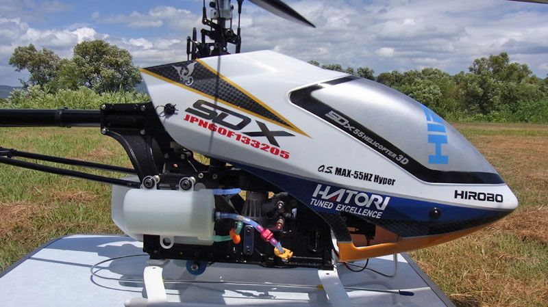 いい感じのまま初号機へ。こちらはいつものように上空~3D中心です。1Fを無事に終え、そのまま2F目へ。ところが2/3タンクほど飛ばしたところで突然異音が…。高周波の混じったような音で最初はギア欠けかと思いました。が、その直後…マフラーが外れてぶら下がってます…。かろうじてプレッシャーパイプでつながっているので落下はありませんでしたが、またいつものトラブルか…と思いそ~っと着陸。ところが降ろしてビックリ、なんと