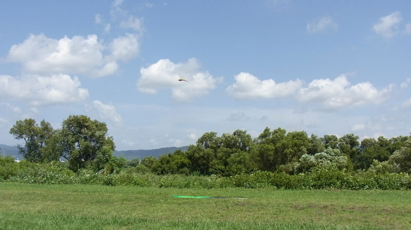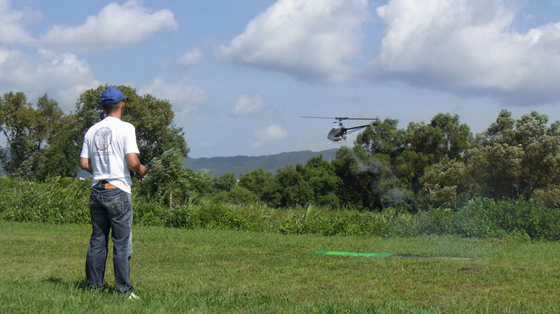 。残暑厳しいため早めにでかけました。飛行場には7時30分すぎに到着したのですが、すでに誰かがヘリをブン回しています。どうやらUさんのよう。僕は2番のりでした