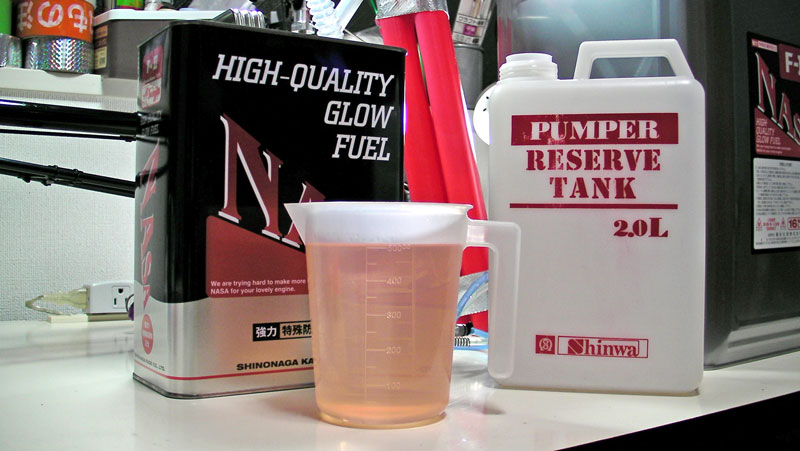 。同じ銘柄ですのでニトロ量以外にはオイルの種類なども違いないだろうと思われ、単純に足しただけです。塗料用のメジャーカップを用意しましたがまぁそれほどシビアでなくてもいいのかも。少なくともメスシリンダーやメスフラスコはいらんでしょう(笑)