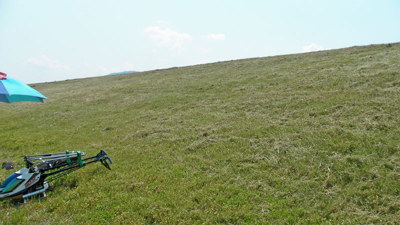 朝から快晴、早速飛行場へ。飛行場側の法面が国土交通省様によりきれいに刈られていました。反対側は後日のようですが、近々行っていただけることでしょう(^^;; さて、さっそくフライト。まずは弐号機からです。600mmの虎屋ローター、いつものやつです。エンジンの調子も良く、ヘッド温度も問題なし。気温が高めなのでややニードルを締めますが大丈夫でした。弐号機は主に静演技〜上空用としていますので、こんな感じかな