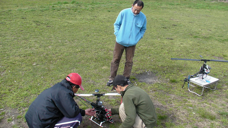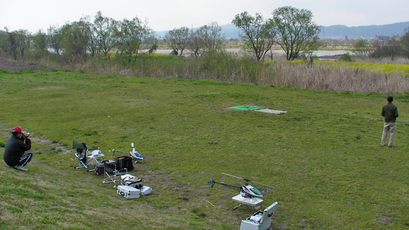 飛行場に着くとJYALAさん、K2さんがフライト中でした。しばらくしてY3さんが様子見に到着。そそくさと初号機に火を入れ隅っこでホバリングさせてみます。やはりジャイロユートラルは大きく狂っていたのでリンケージロッドの長さでニュートラル出しに専念。ピッチは若干ずれているようですがフライトに支障なさそうな範囲かと思いました。何せ時間がありません