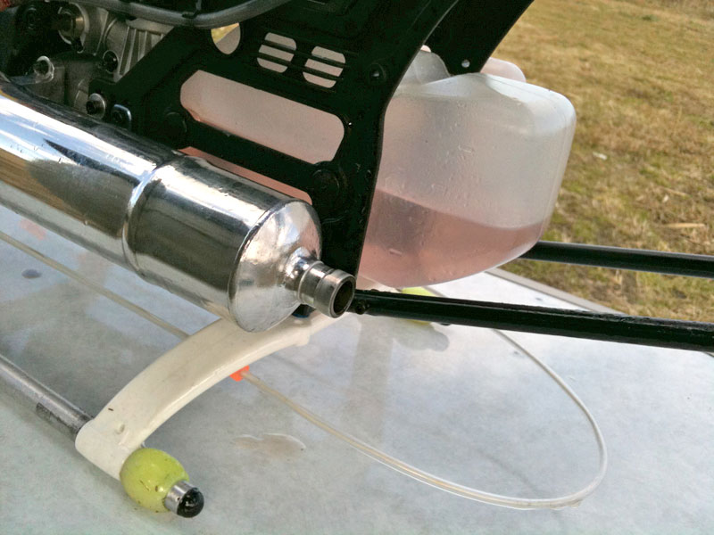 。風もないのにおかしいなぁ・・・。ハンチングじゃなさそうだし・・・ジャイロ感度を下げても2〜3Hzで横揺れです。とりあえず上空へ遣ってみましたがテールが安定せず1/3タンクほどで一旦引き上げ。おまけにマフラーエンドの排気チューブまでぶっ飛ぶ始末・・・