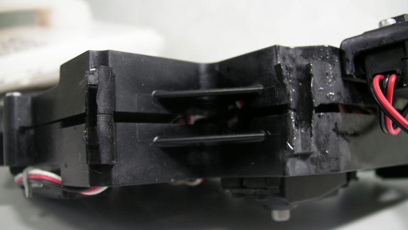 何とか載せ替えを終えました。意外に弱いのがカラー勘合部。ここだけプラスチックの厚みが薄めになっています。特に中程は薄めですのでちょっとした衝撃で割れてしまうようです。おそらくカラーが挿入しにくくなるなどの理由かも知れませんが、ここをもう少し強化すればずいぶん丈夫になりそうな感じですね