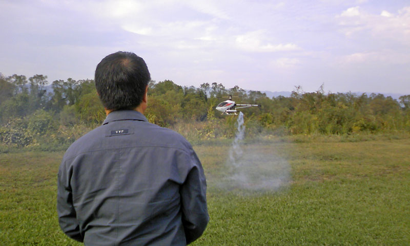 EさんはSDX持参です。55HZ+56NS、スワッシュサーボはS9255。電源はリポで6V弱の分電を行っているようです。なかなか飛ばせないそうなので指&エンジン慣らしとのことでしたが・・・。実際に飛ばし出すとかなり激しく行ったり来たり