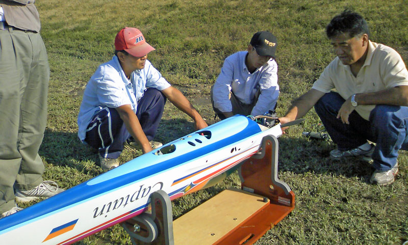 なにやら皆さんお集まりのようでちょっと覗いてみるとT口さんの大型GP機、Captainです。数年前に一度見かけたことがあるようなないような・・・。なんせヘリを初めてまもなくの頃でしたから記憶が定かではないのですが、その後早々に電動に切り替えられたのではなかったかと。今日はエンジンがかかるかどうかテストしに来場された模様。それにしても140サイズの4サイクルエンジン(YS DZ-140?)は何とも言えない独特の音です。まるでバイクみたいです。いかにも【エンジン!】といった感じですかね。明日はフライトさせてくれることでしょう。