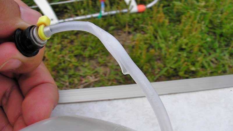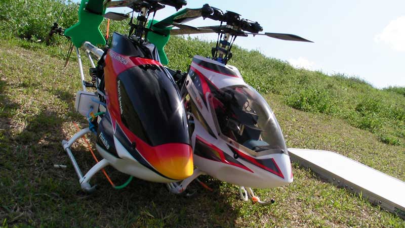 。高さがそこそこあったのですぐにHOLDをいれ、ややハードランディングでしたが何とか不時着。タンク内のシリコンチューブがざっくり裂けてました(^^;; 予備のチューブを使いホバリングさせ機体を点検。特に問題なさそうでしたが、こういうときは慎重になるに越したことはないので壱号機終了。