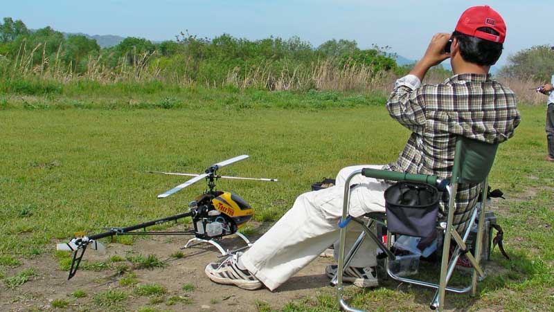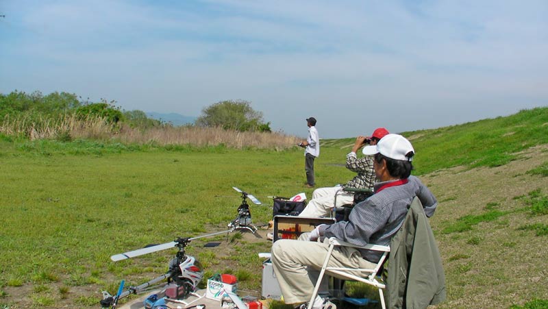 。いつものように移動途中で偵察に。Kさん、K2さん、I戸さんがお見えでした。I戸さんのT-REX450は完成したもののバッテリの充電未了のため今日はお預けとの由。また、T-REX700Nはテールの調子が悪かったようですが、どうやらテールブームブレースエンドの接着が外れかけていて振動していた模様。おそらくDAMAGEで記事にされることと思います。 午後3時頃の風景。人数少なめです。