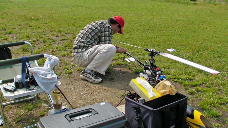 ちょうど飛ばし終えた後らしく休憩中でした。本日は代休だったとの由。I戸さんはいつものT-REX700です。すでに4タンクほど飛ばしたそうですが、ニードル位置などエンジン調整に手こずったとのこと。相変わらずのグリグリ3Dですが、何度見てもどうやって操作しているかさっぱりわかりません(笑)この時の様子はDAMAGEでご覧いただけます。