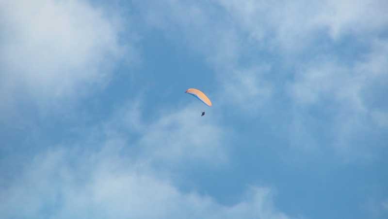 でした。飛行場には2番のり。すでにYさんはT-REX700を飛ばしている最中でした。 左:近くを飛行中のパラグライダー 右:すでにスカディーは小破状態
