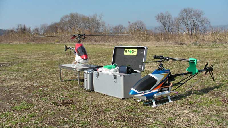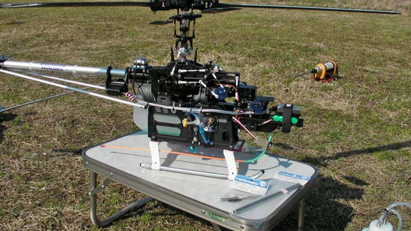 今日は弐号機・参号機の2台体制で出動。エンジンはYS/OSですが、どちらもHPMというところが共通してます。そそくさと準備をし、早速参号機の調子を見ます。エンジンも一発で始動し、快調です。トラッキングがずれているように感じられたので何度か降ろして調整。また、振動が気になったので予備パーツで持ってきていたメインマストとスピンドルを変更。回転数を若干上げたこともあるのでしょうがイヤな振動も感じられなくなりました。 現場で補修してみました