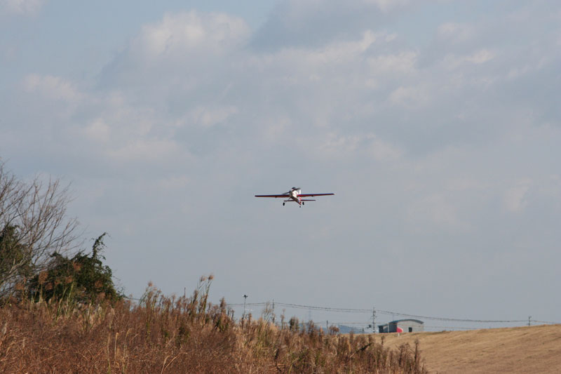 でしたので飛行場へと赴きました。受信機トラブルでOS-HPMは調整できませんでしたので、OS-SWMスカディ(壱号機)とYS-HPMスカディ(弐号機)を持って出動です。飛行場には飛行機組のYさんとTさんがおられるだけでヘリ組は誰も来ていない様子。ちょうどTさんが飛ばし終えて後だったので早速飛ばすことにしました。