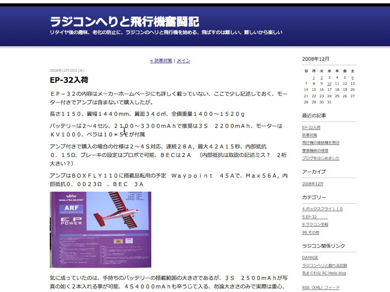 このブログでも何度か紹介させていただいているH中さんですが、ついにブログを始められたとの由。タイトルは【ラジコンへりと飛行機奮闘記】。ヘリがひらがなというのは、あえてのことなのかそれとも・・・(笑)